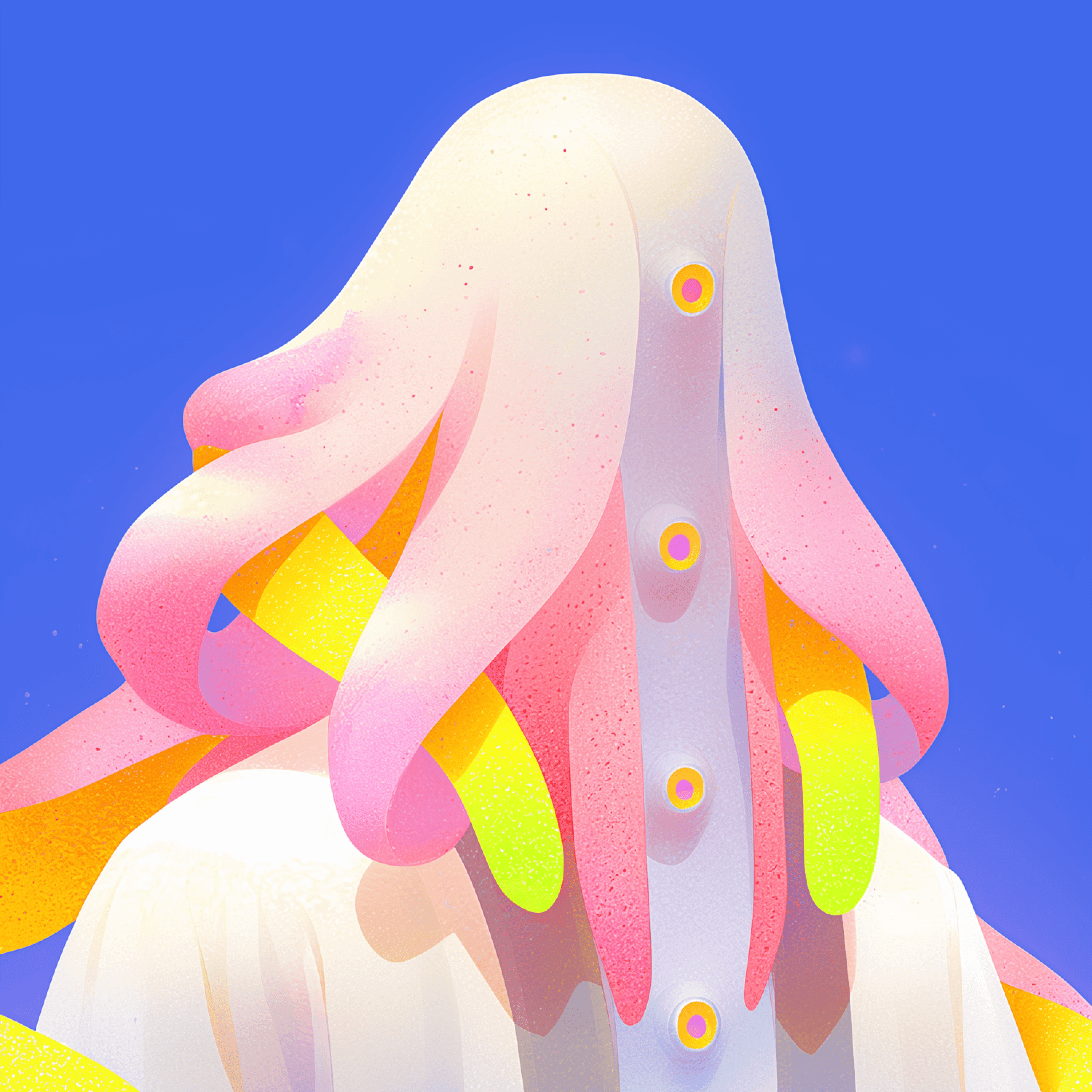 Blends brand strategy and graphic design to create otherworldly character visuals, balancing surreal forms and soft color harmonies.